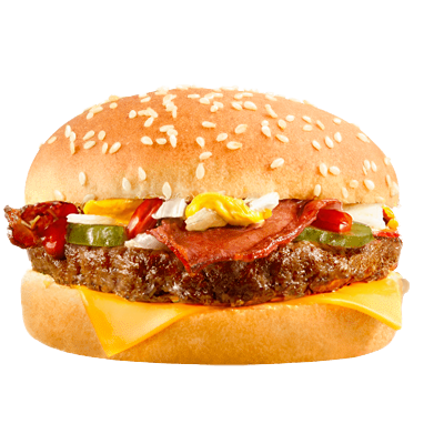 Le Maxi Bacon : un steak juteux, du bacon croustillant, un œuf savoureux, des cornichons croquants et une sauce barbecue fumée pour une explosion de saveurs irrésistibles.